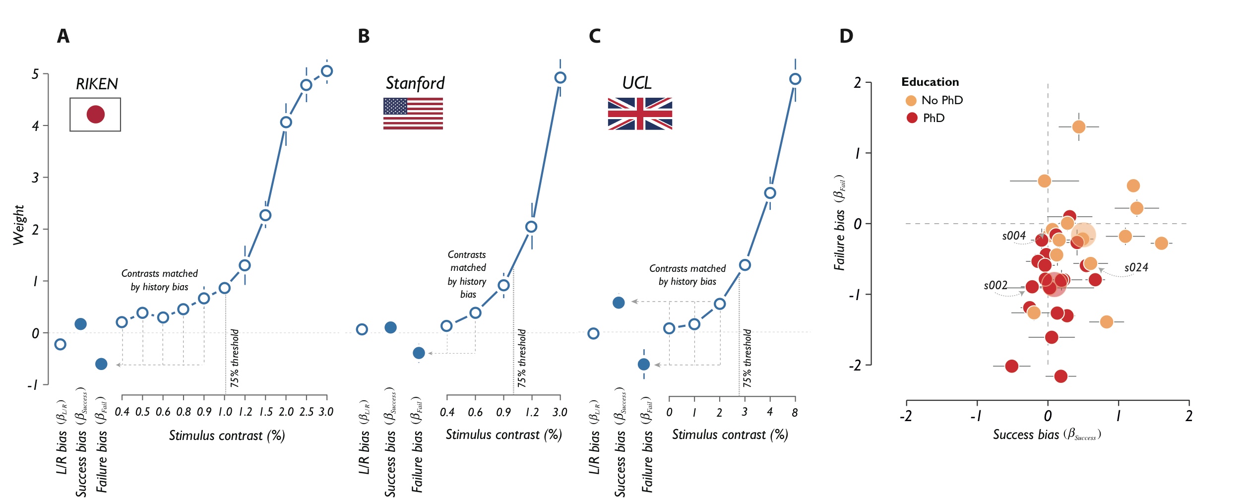 Figure 3. Quantifying choice-history biases. A, B, C: Choice-history and contrast weights of probabilistic choice model averaged across subjects for data collected across diverse demographics at RIKEN (A), Stanford (B) and UCL (C). Error bars are bootstrapped SEM. D: Success and failure biases of individual subjects colored according to whether subjects had (or were in the process of obtaining) a PhD (red, large dot is mean across these subjects) or not (orange). Example subjects from previous figures are indicated. Error bars are SEM.